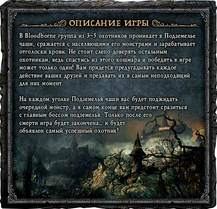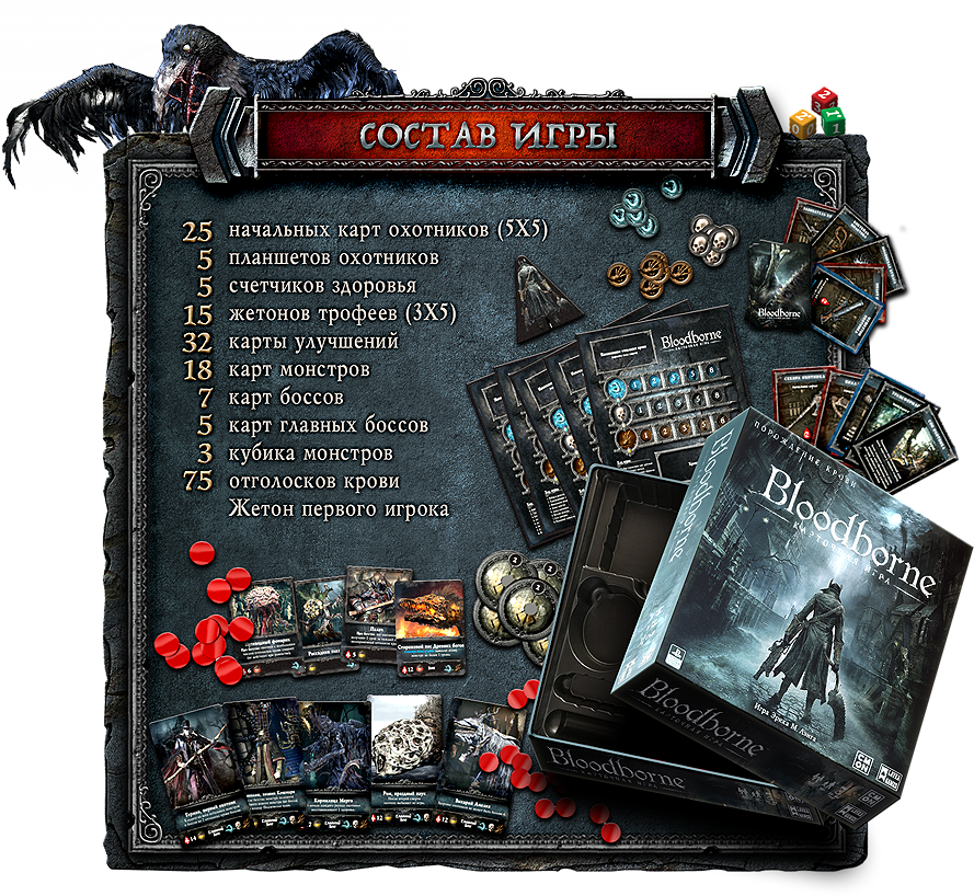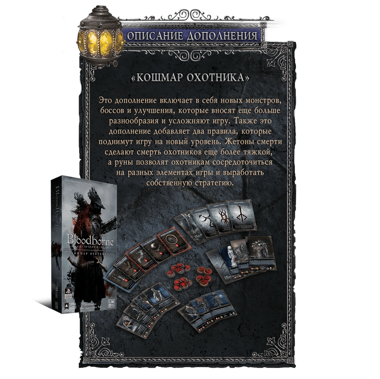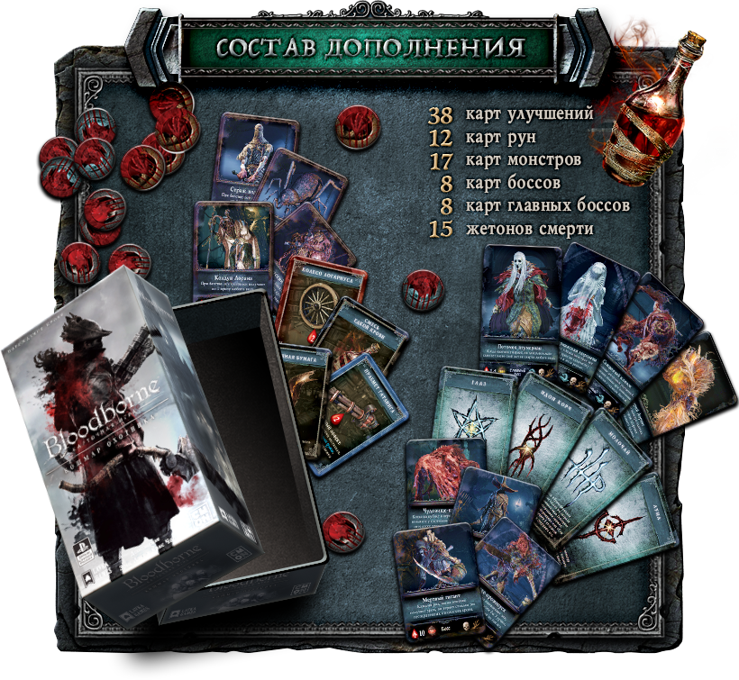 Ретираж настольной игры, основанной на вселенной культовой видеоигры «Bloodborne: Порождение крови». С дополнением «Кошмар охотника»!