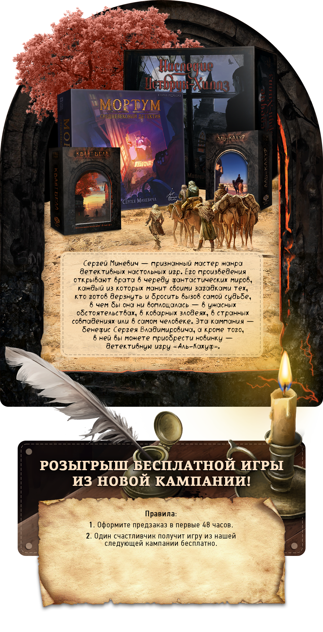 Этот предзаказ посвящен настольным детективам от одного из именитых авторов отечественного игропрома, Сергея Миневича. Погрузитесь в мир тайн и расследуйте дела в "Наследие Истбрук-Хиллз", "Мортум" и многих других проектах! Примерный срок поступления на склад: лето 2026