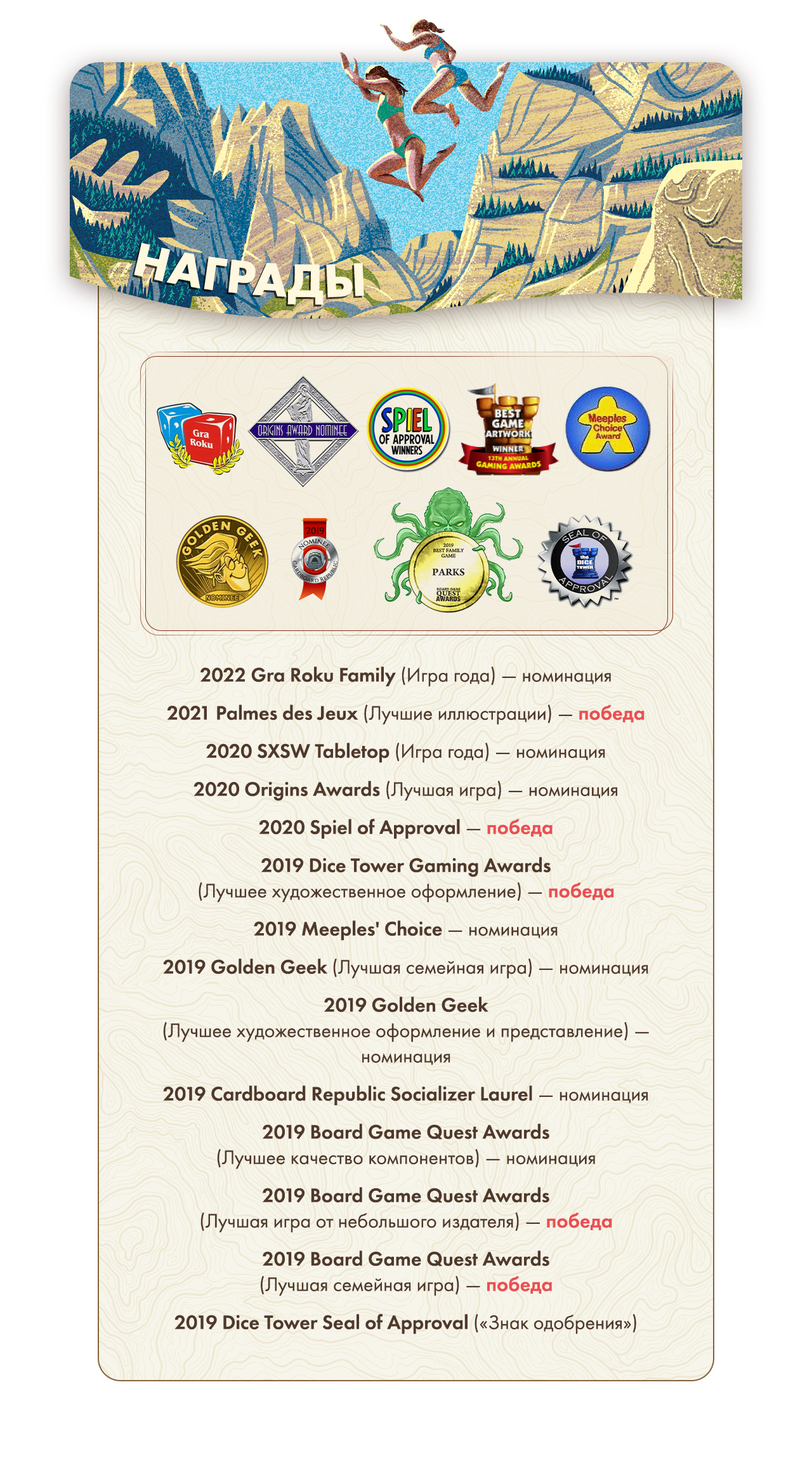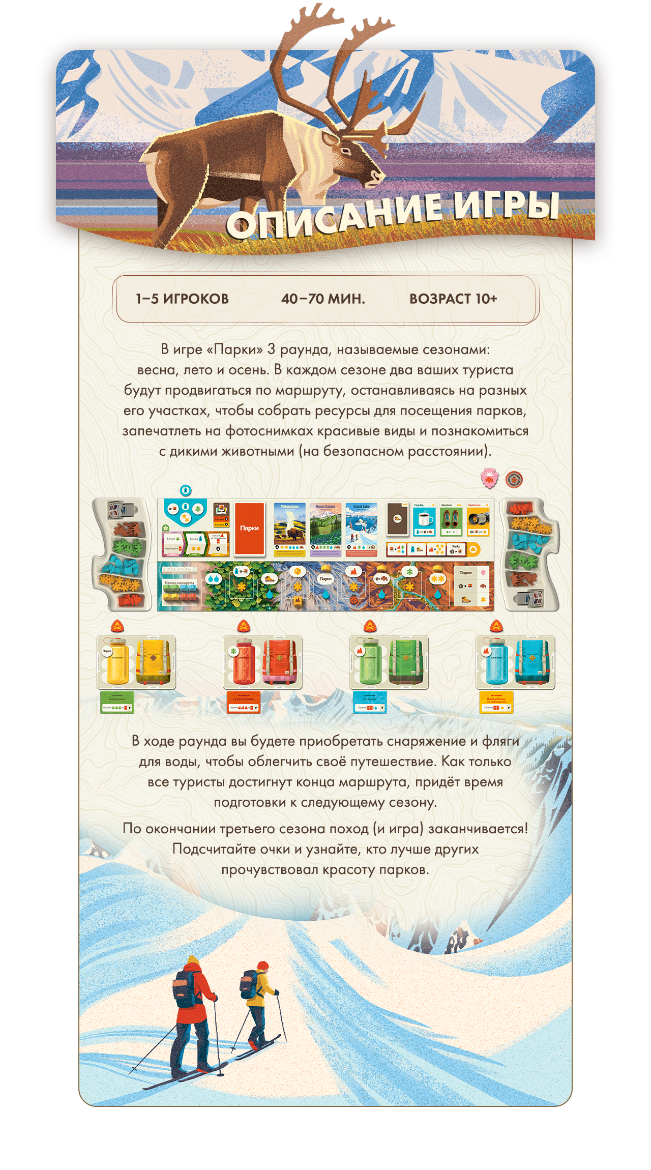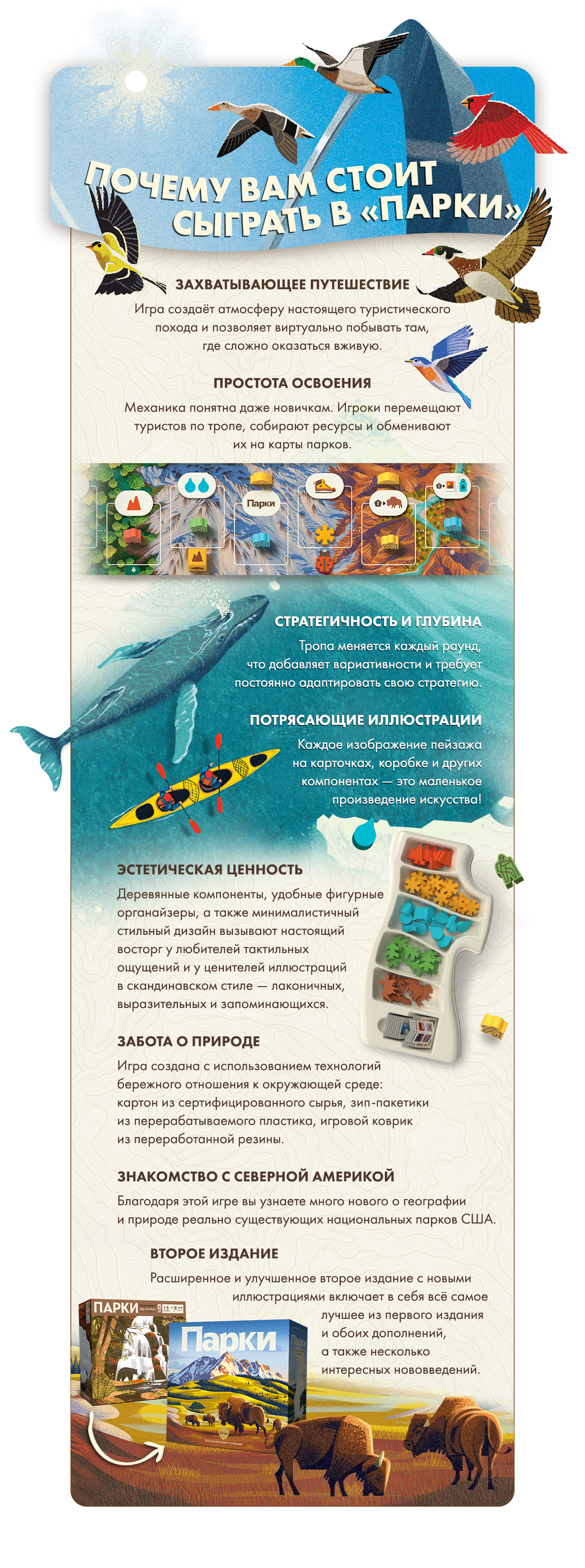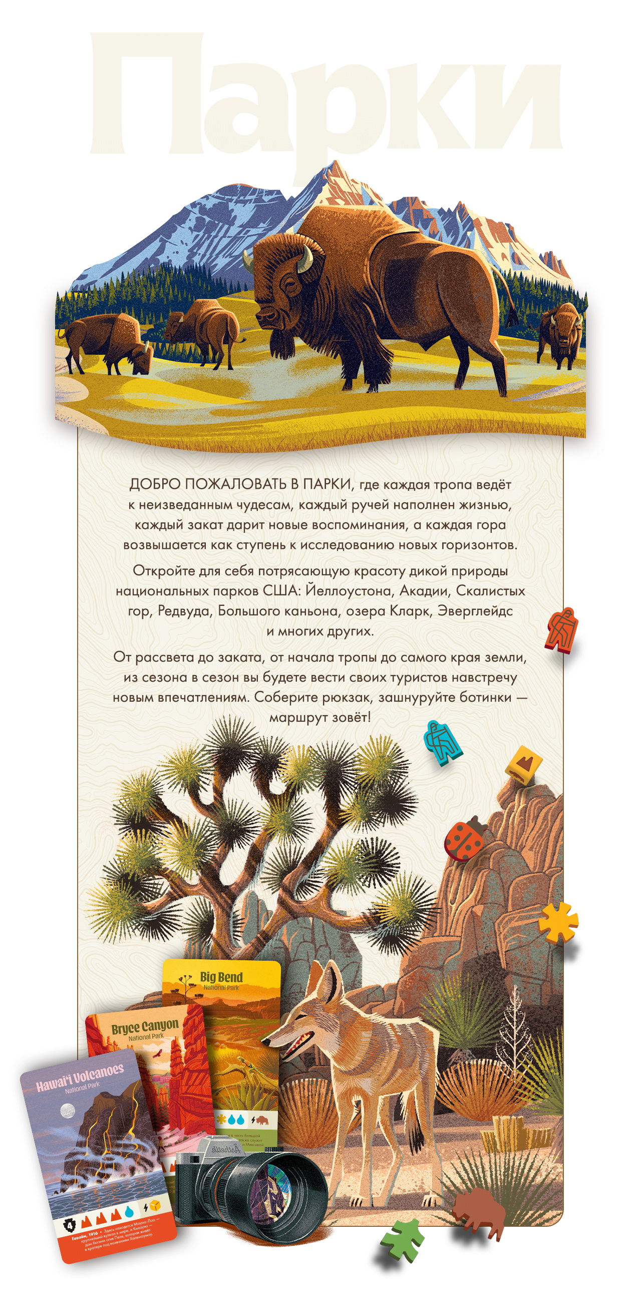 Побывайте в каждом заповедном уголке, запечатлейте каждый прекрасный момент и насладитесь чудесами природы Национальных парков США в роскошной настольной игре «ПАРКИ»!