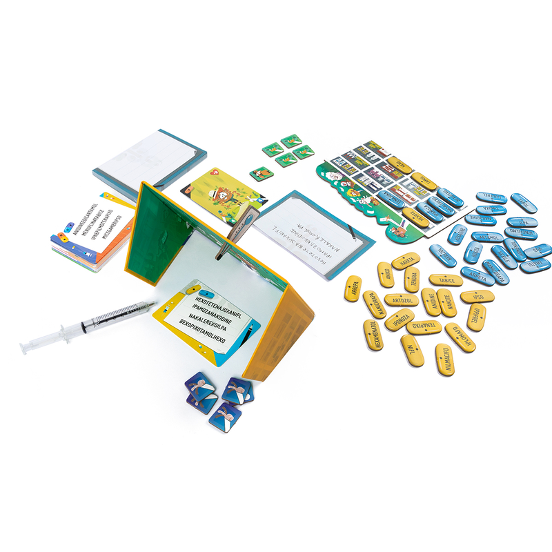 Затем за 2 минуты остальные игроки-аптекари должны расшифровать записи доктора и составить названия лекарств с помощью специальных жетонов пилюль, на которых написаны части слов или символов.