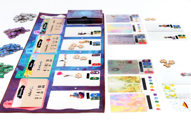 Подготовка к игре очень проста: разложите планшет творчества и разместите на нём 4 карты ПО — они определят условия получения победных очков за созданные картины.