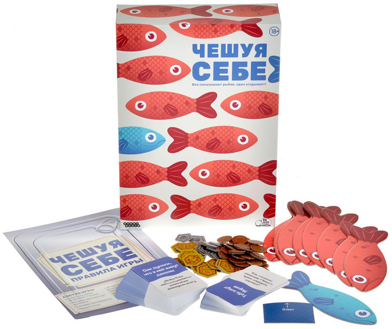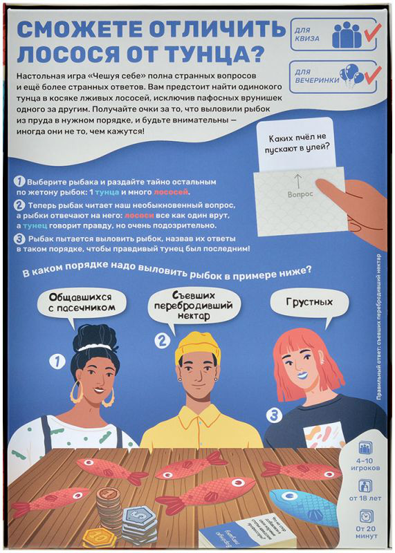 "Чешуя себе" – это весёлая игра для вечеринок, где каждый следующий вопрос страннее предыдущего! Представьте себе, что вы рыбак, пытающийся выловить одинокого тунца среди лживых лососей. Ваша задача – отличить правду от вымысла и вычислить, кто из рыб говорит правду!