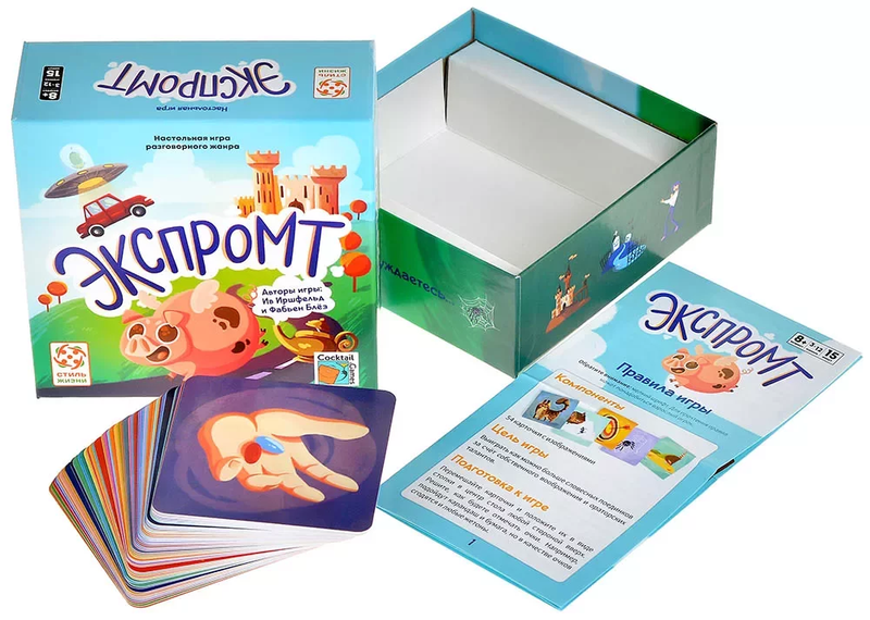 "Экспромт" – настольная игра для весёлых компаний, которая раскрывает таланты каждого игрока. Её сердце – более пятидесяти карточек с яркими и забавными иллюстрациями, которые служат источником вдохновения для создания историй, ведения дебатов или остроумных диалогов. Уникальность игры – в нескольких захватывающих режимах на выбор. Каждый раунд – это новое приключение, где вам предстоит блеснуть красноречием, чувством юмора и быстротой реакции. Игра прекрасно подходит для семейного досуга, дружеских встреч и даже тренингов, развивая навыки общения и творческое мышление у игроков любого возраста.