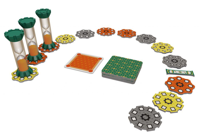 Песочные таймеры опираются на плитки Gear, каждая из которых отличается своим сочетанием формы и цвета. Каждая из ваших карт изображает только 1 фигуру или 1 цвет из всех доступных, и когда вы разыгрываете карту, все песочные таймеры на соответствующих плитках переворачиваются и переходят к следующей плитке — хотите вы этого или нет.