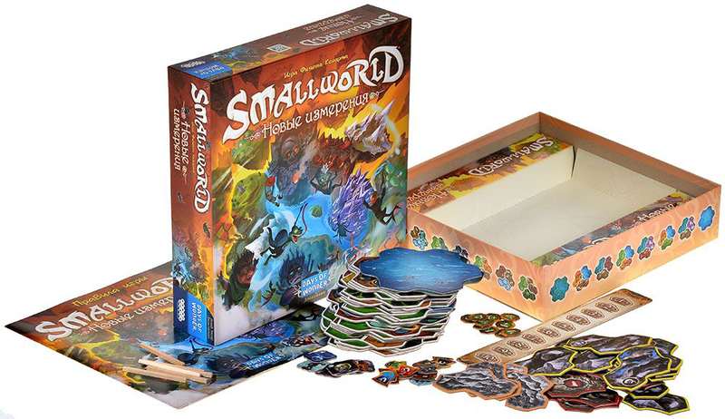 Дополнение "Новые измерения" позволяет создавать собственные игровые поля с помощью нескольких десятков двусторонних фрагментов, а также придумывать уникальные сценарии борьбы за регионы Маленького мира. Поймать вдохновение помогут 12 готовых сценариев, которые можно проходить, используя как игру "Small World: Маленький мир", так и "Small World: Подземный мир", а также любые дополнения.