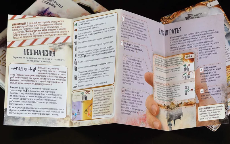 Начните игру с первой карты, не перемешивая колоду. На каждой карточке вас ждёт описание ситуации и варианты действий. Выбирайте, следуйте указанным иконкам: меняйте показатели, берите новые карты, переворачивайте или сбрасывайте их. Управляйте ресурсами, накапливайте влияние и стремитесь к той концовке, которую заслужили.