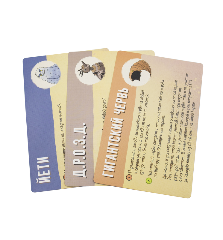 Дополнение для игры "Пернатые" содержит разнообразные уникальные компоненты: карты способностей, добавляющие асимметрии, особые обитатели фермы и дополнительные карты целей.