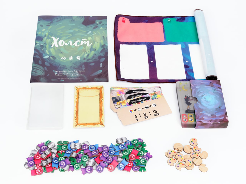 Подготовка к игре очень проста: разложите планшет творчества и разместите на нём 4 карты ПО — они определят условия получения победных очков за созданные картины.