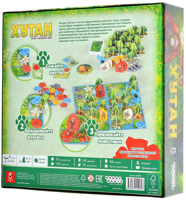 "Хутан" – что в переводе с индонезийского означает "лес" – предлагает вам стать творцом собственного тропического рая! Это увлекательная настольная игра с невероятно красивым оформлением, где вы будете создавать трёхмерные ландшафты дождевого леса. Высаживайте разноцветные бутоны, взращивайте пышные кроны деревьев и привлекайте в свою экосистему редких животных – от забавных панголинов до величественных птиц калао. Модульные поля и постоянно меняющийся рынок цветов обеспечивают бесконечное разнообразие стратегий, а тактическая глубина сочетается с интуитивно понятными правилами. Отличная реиграбельность, несколько вариантов сложности и потрясающие компоненты!