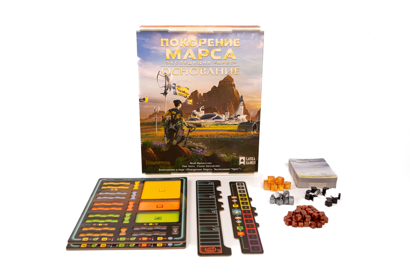 Дополнение «Основание» содержит дополнительные планшеты, карты фаз и кубики — теперь в игру «Покорение Марса. Экспедиция „Арес”» могут играть до шести участников.