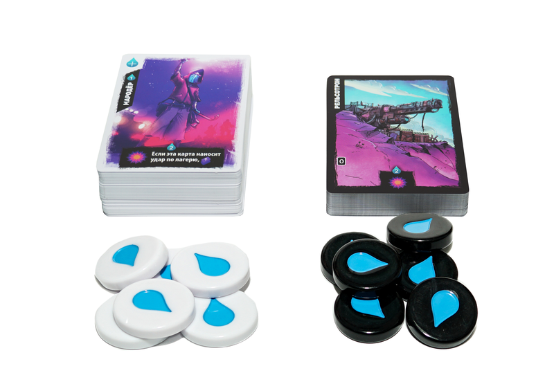 Оба игрока берут карты из общей колоды. Вы можете разыграть все карты с руки, либо сбросить их ради мгновенных эффектов. Действуйте обдуманно, чтобы победить.